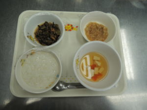 粥、鱈のおろし煮、ひじきとツナの煮浸し