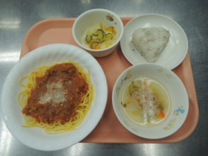 スパゲティミートソース、キャベツの甘酢和え