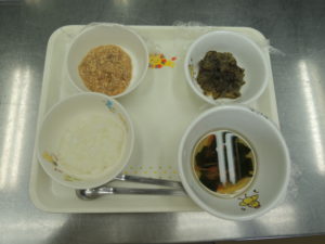 粥、鶏肉の味噌煮、春雨と若芽の煮浸し