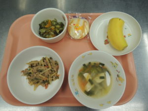ご飯、チンジャオロース、胡瓜の甘酢和え、にらと豆腐のスープ