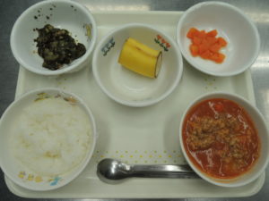 軟飯、豚肉のトマト煮、ツナと胡瓜の煮浸し