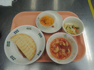 キャベツのゴマ入りサラダ、じゃが芋とトマトのスープ